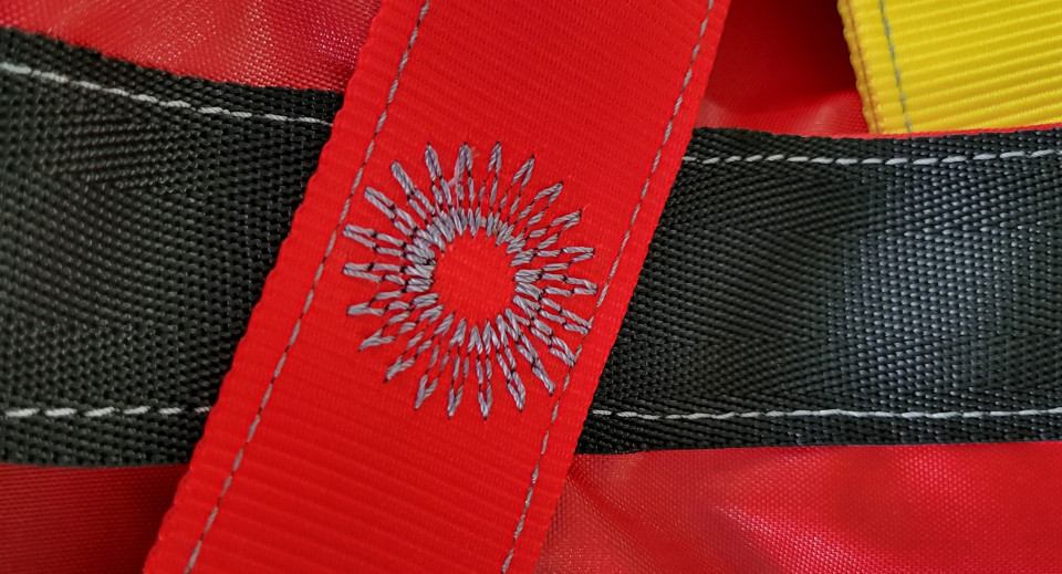 Hier wird gerade das Logo auf eine Tasche aufgenäht.